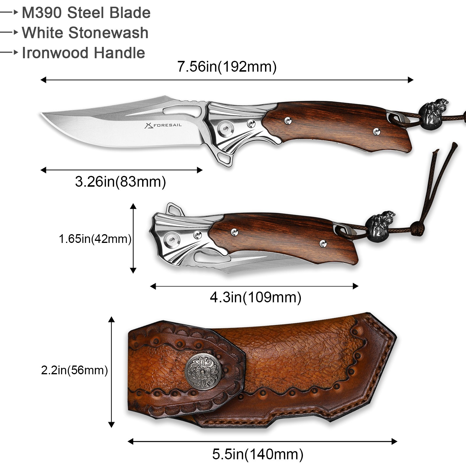 FORESAIL Flipper Pocket Folding Knife,M390 Steel Blade and Wood Handle. With leather case,men's pocket knife hiking trip EDC tool Knife.