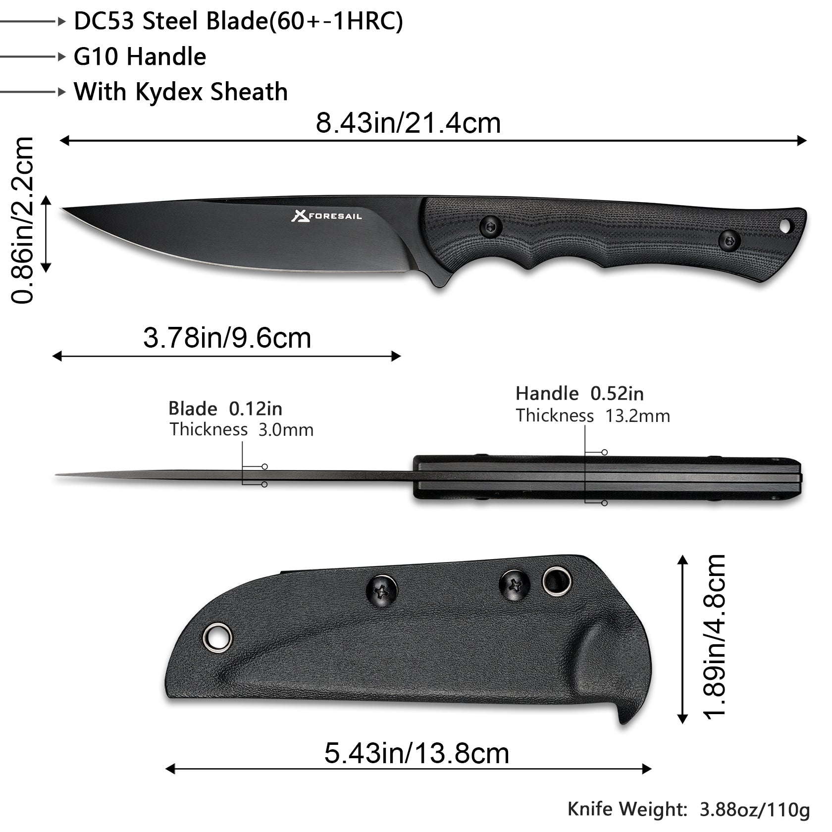 FORESAIL Fixed Blade Knife,3.86inch DC53 Steel Blade and G10 Handle,with Kydex Sheath,Fixed Blade EDC Tactical Knife for Men Women, Outdoor Hunting Hiking Survival Camping Knives.