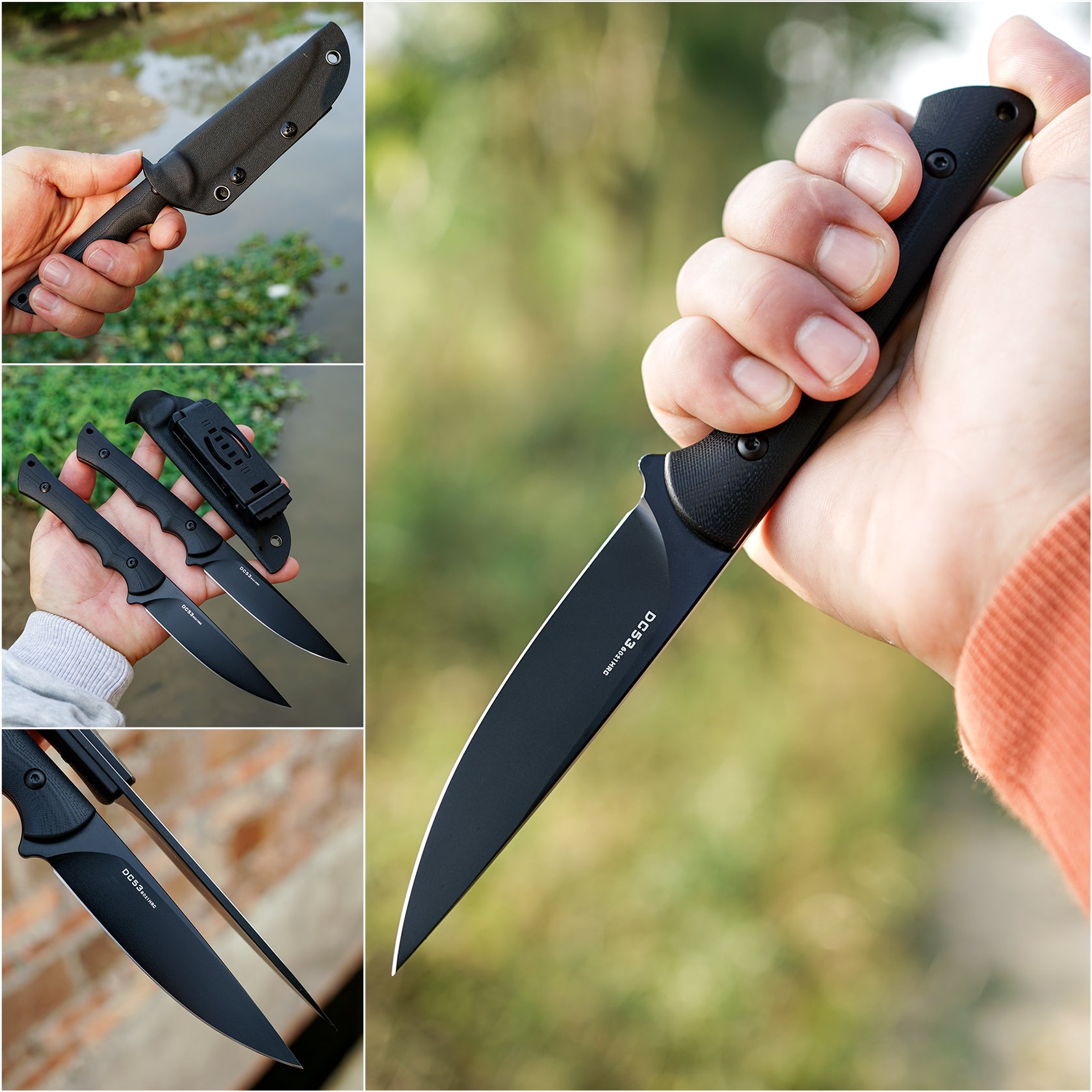 About this item- Razor Sharp Knife Blade-----This 7.56-inch fixed-blade knife is crafted from premium DC53 steel。known for its exceptional sharpness and durability; This knife steel easily handles various cutting tasks and maintains sharpness during use