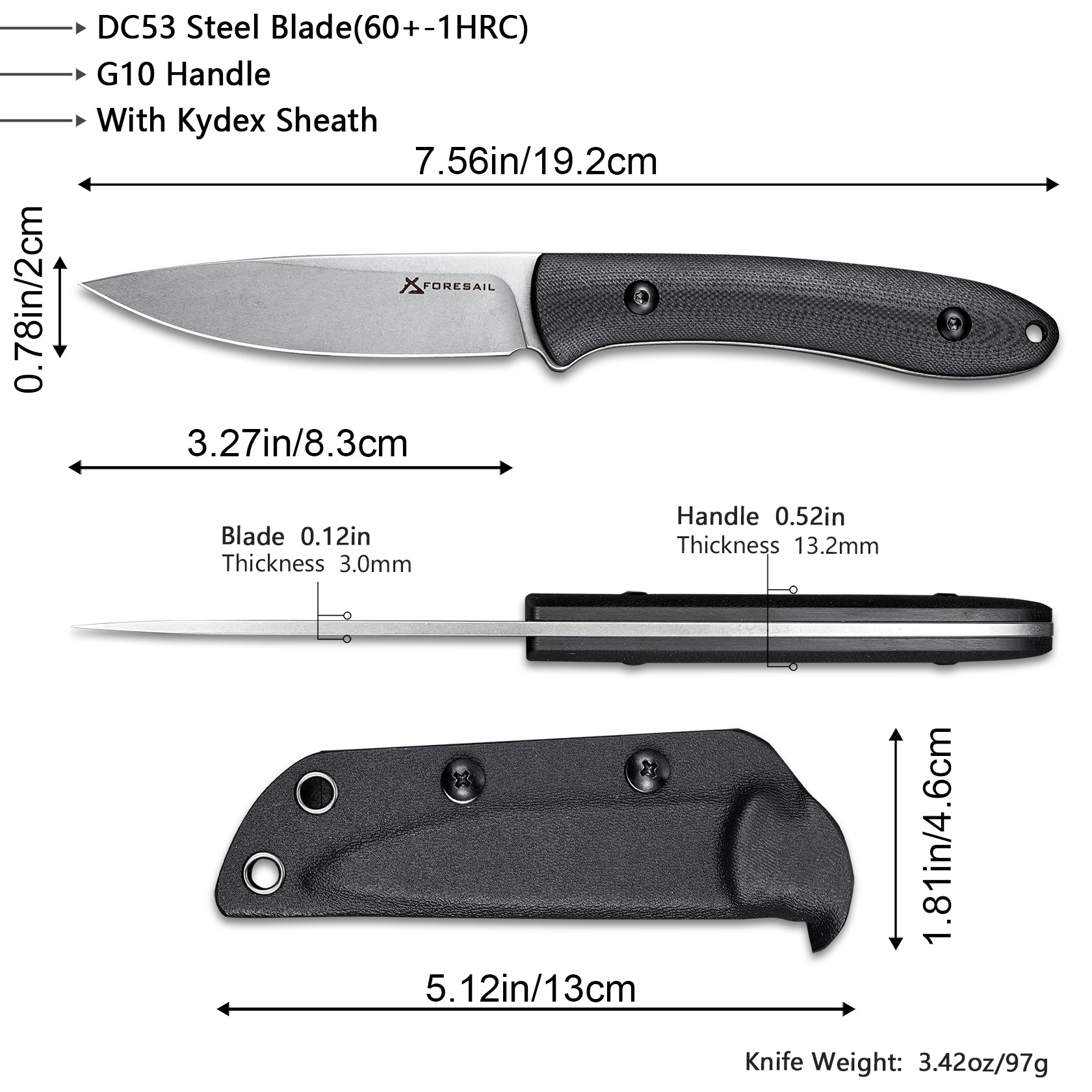• Razor Sharp Knife Blade-----This 7.56-inch fixed-blade knife is crafted from premium DC53 steel。known for its exceptional sharpness and durability; This knife steel easily handles various cutting tasks and maintains sharpness during use