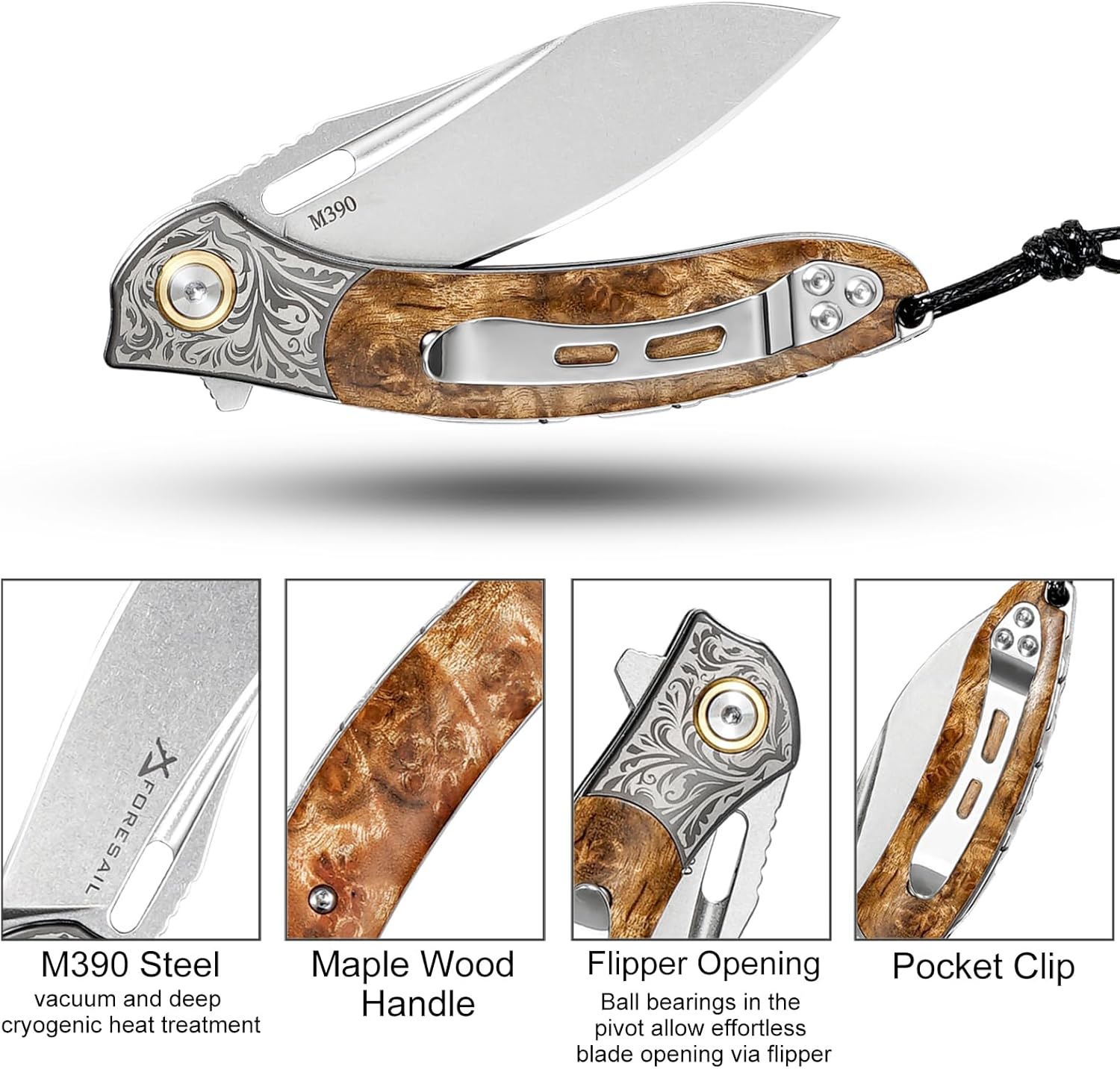- 【High Quality Pocket Knife】:High Quality Austrian M390 blade,The blade hardness 60-61HRC, provides good balance of razor sharp cutting performance and high toughness. Ergonomic handle for comfortable and stiff grip, excellent low moisture absorption and chemical reistance