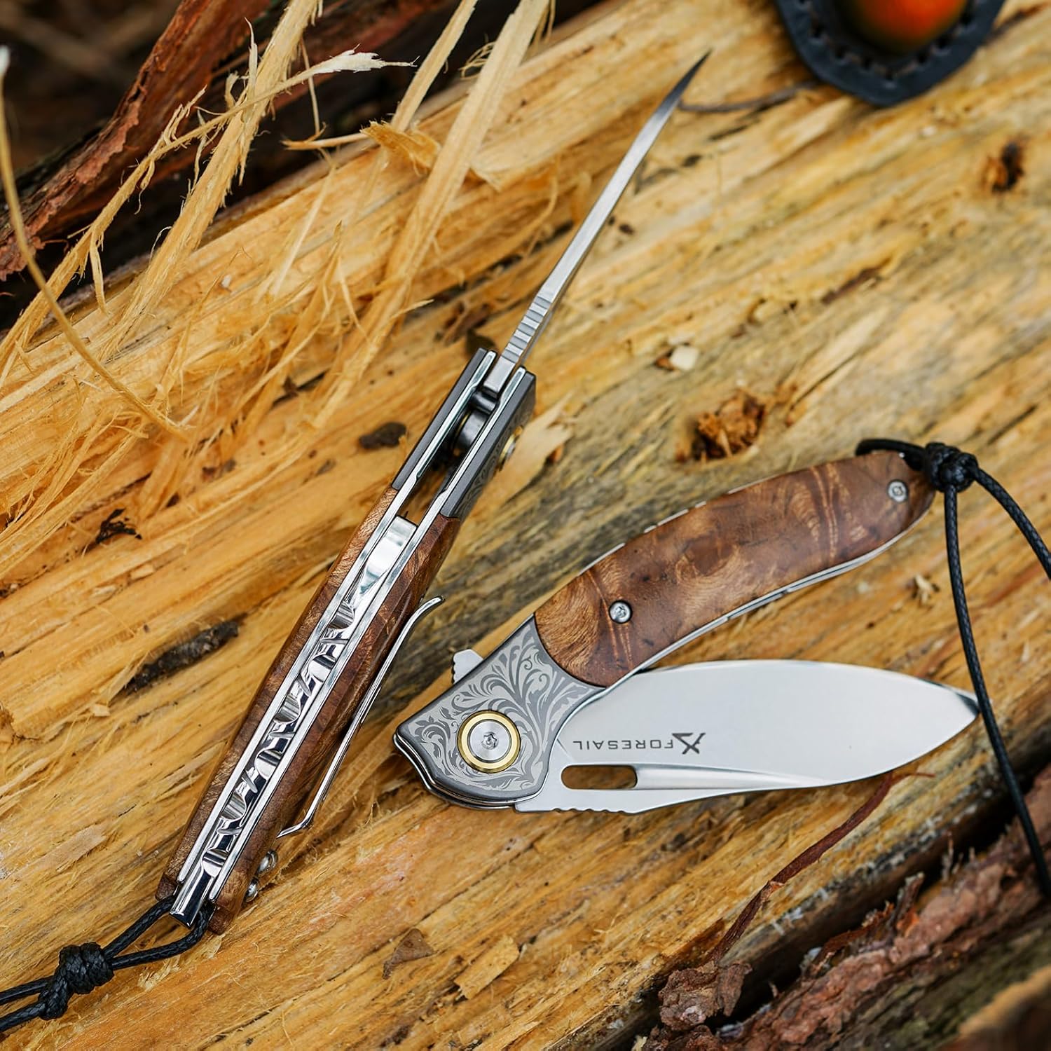 - 【Maple Wood Handle】: 4.09-inch long handle, comfortable handle. Japanese style pattern Bolster and Maple Wood Handle, ball bearing flipper with everyday carry, the flipper opens with a ceramic ball bearing pivot system for smooth and fast blade deployment while keeping the user safe.